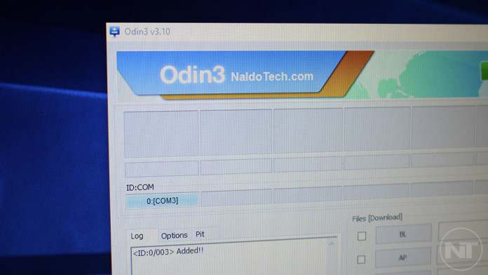 - buka odin.exe dan lihat tanda biru di kotak sebelah kiri odin yang menunjukan kalau perangkat android sudah siap Flash, Jika tidak ada tanda ulangi langkah dari No 4